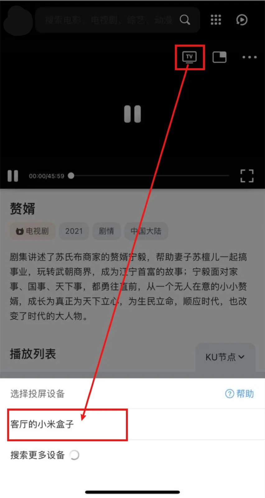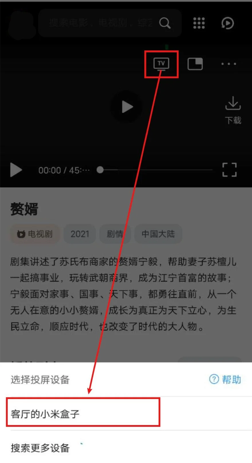 打开QQ浏览器(会接管网页播放器)->打开好看影视->播放视频->选中投屏图标->等待搜寻出智能电视/电视盒子->选中,即可投屏。